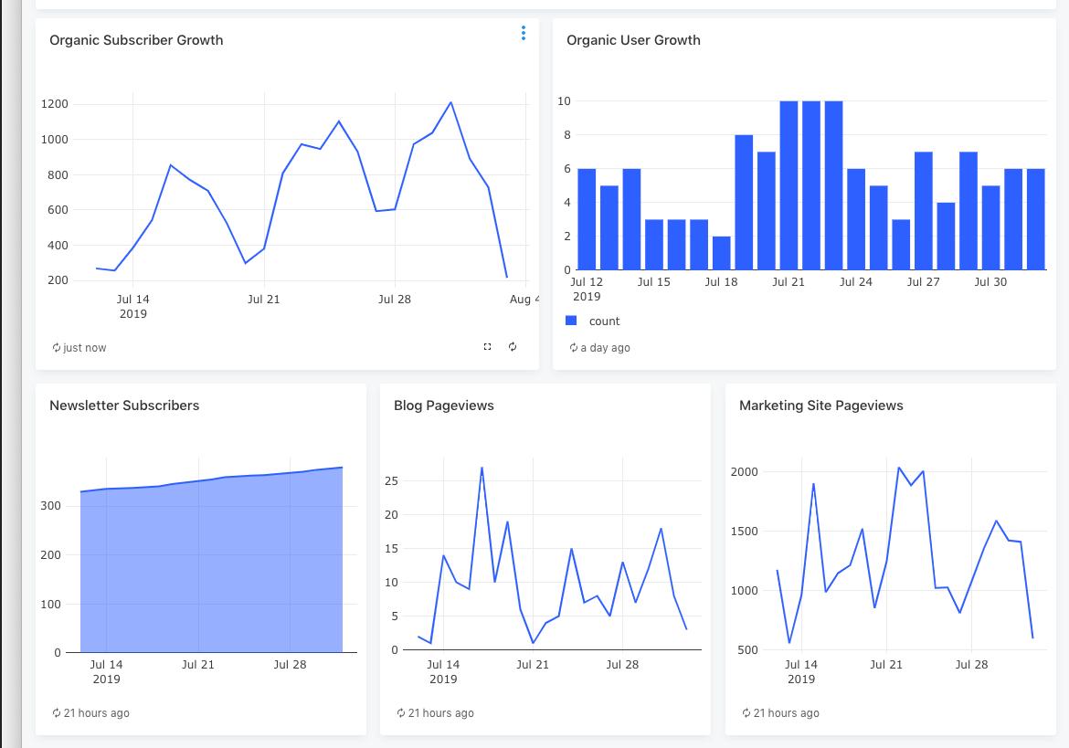 I wrote a couple weeks ago about Project Eyeglass, my attempt to build out an administrative metrics dashboard for Buttondown. This was going to give me a more data-driven view into things I should be caring about at this stage, like growth and user activity over time.