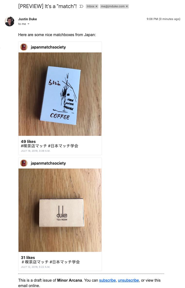 takes any paragraph that just contains an Instagram link, fetches the data for it, and spits out a template. This means I don’t have to do anything gross with regular expressions or syntax trees or fallback logic; Past Me has already taken care of that.