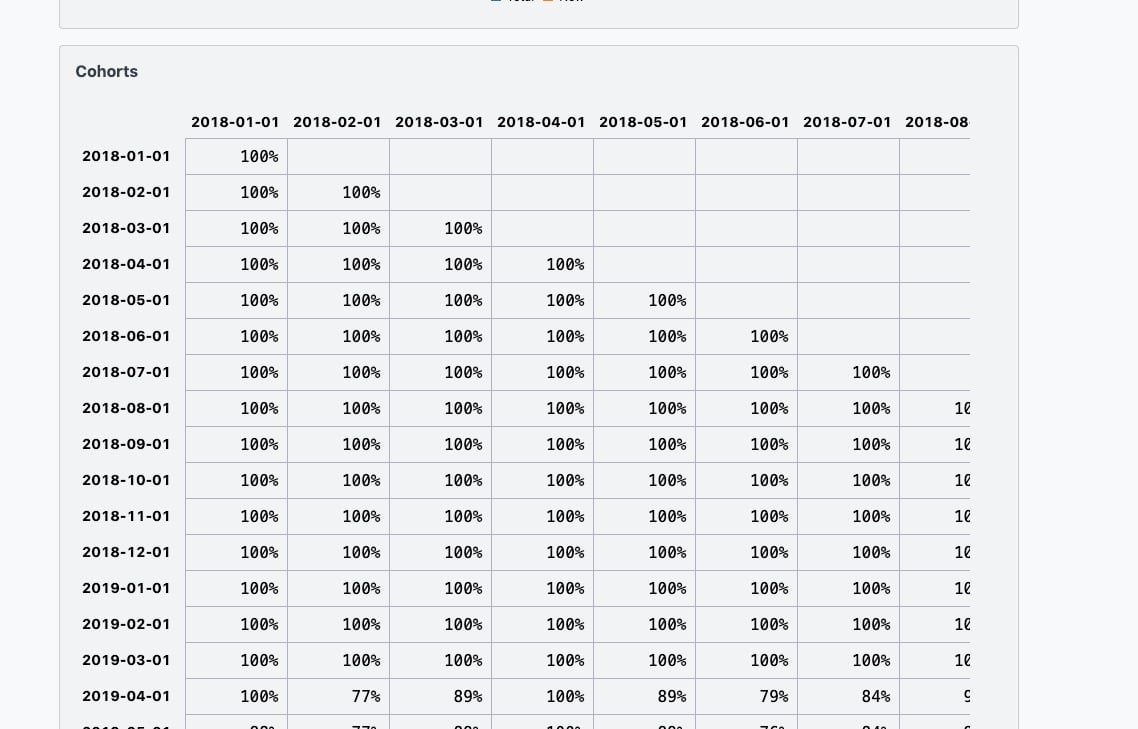 A feature that I succumb too easily to is that of the form "this is probably not going to help too many people but will be inoffensive and fun to build." March's version of that is subscription cohort charts, which plot subscriber drop-off bucketed by certain times. Here are some very gross WIP screenshots:
