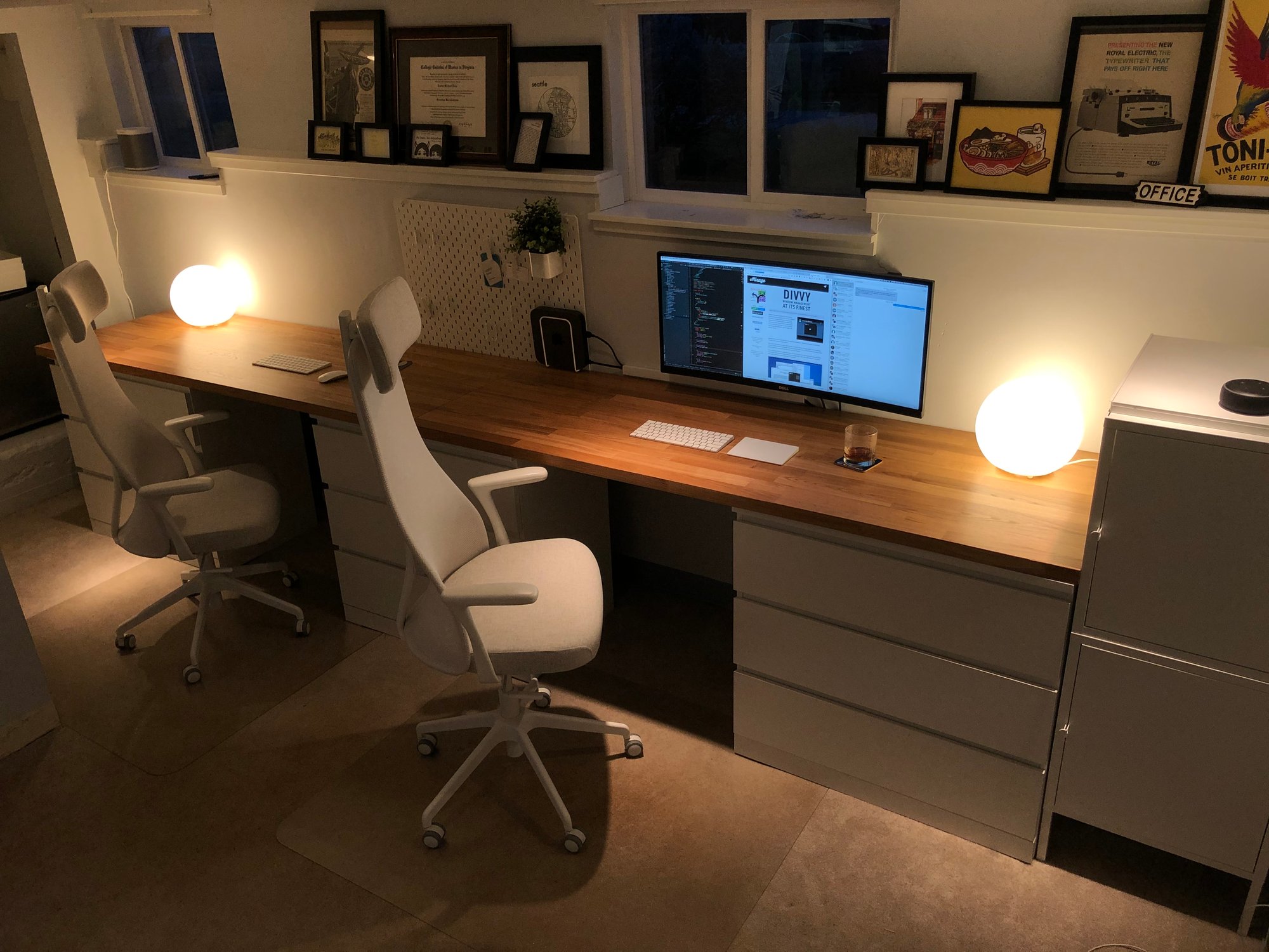This falls squarely into 'Ikea hack' territory, a content genre unto itself: our double desk is not so much a desk as it is three dressers and two kitchen countertops, a tactic we purloined from others. It is very pretty and very nice and I am more excited than ever to spend mornings and evenings in this lovely space.